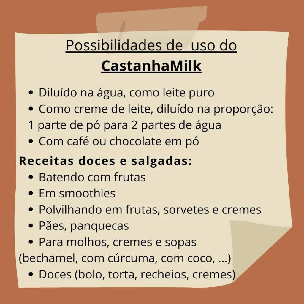 O CastanhaMilk é um leite em pó vegetal, pode ser usado com café, achocolatado, na vitamina, receitas doces e salgadas. É para ser usado exatamente como um leite em pó.
