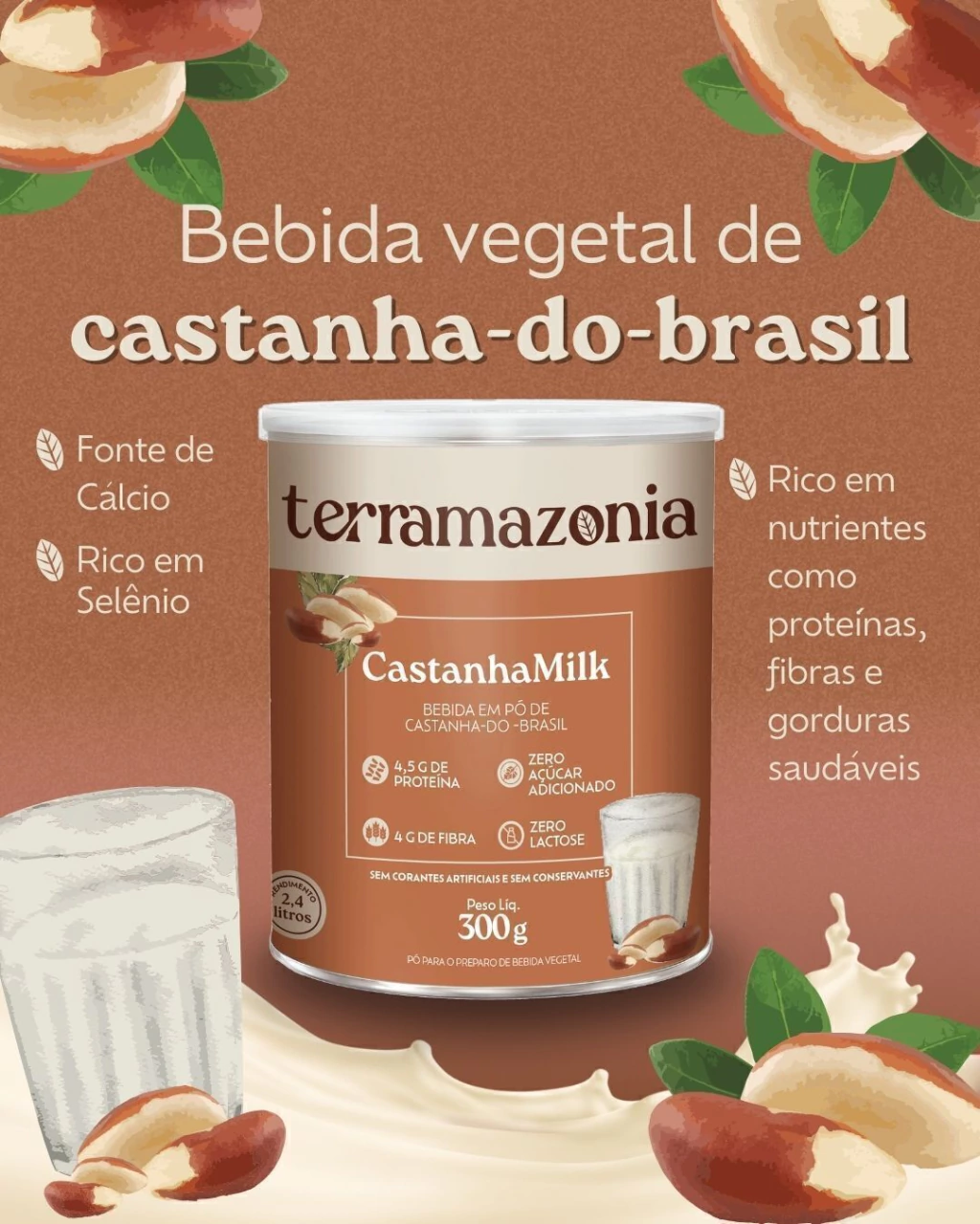 CastanhaMilk: Proteína concentrada de castanha-do-brasil, polidextrose (fibra alimentar), lecitina, minerais [cálcio (carbonato de cálcio), magnésio (carbonato de magnésio) e ferro (pirofasfato férrico)], vitaminas [vitamina C (l-áscorbato de sódio), vitamina B3 (nicotinamida), vitamina B5 (D-pantotenato), vitamina B1 (mononitrato de tiamina), vitamina B6 (cloridato de piridoxina), vitamina A (acetato de retinila), vitamina B7 (D-biotina), vitamina D (colecalciferol), e vitamina B12 (cianocobalamina)], aroma ID natural de leite, goma xantana, goma guar.