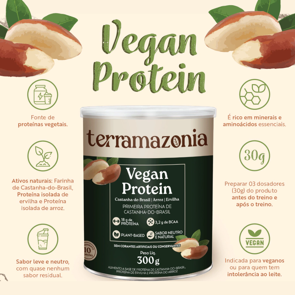 VEGAN PROTEIN é uma proteína vegetal que traz como inovação uma nova fonte de proteínas vegetais: a castanha-do-Brasil. A nossa proteína apresenta um excelente perfil de aminoácidos, capazes de suprir o organismo de aminoácidos essenciais (aqueles que não podem sintetizados pelo nosso organismo). E tem mais uma vantagem: Possui um sabor leve e neutro, com quase nenhum sabor residual característico de outras proteínas veganas. Indicada para o público vegano ou para aqueles que tem intolerância ao leite e desejam adicionar uma fonte de proteína a sua dieta.